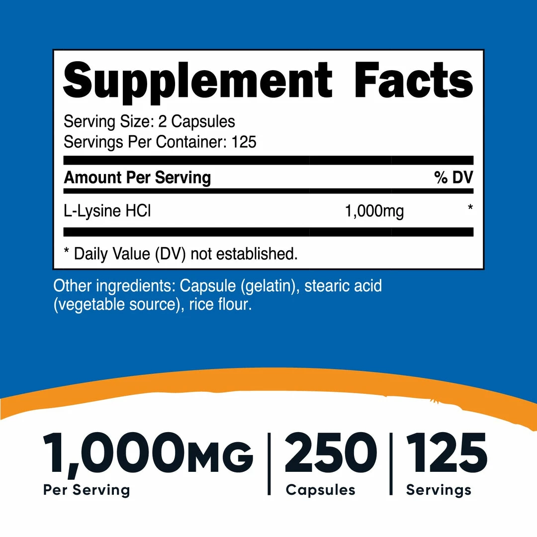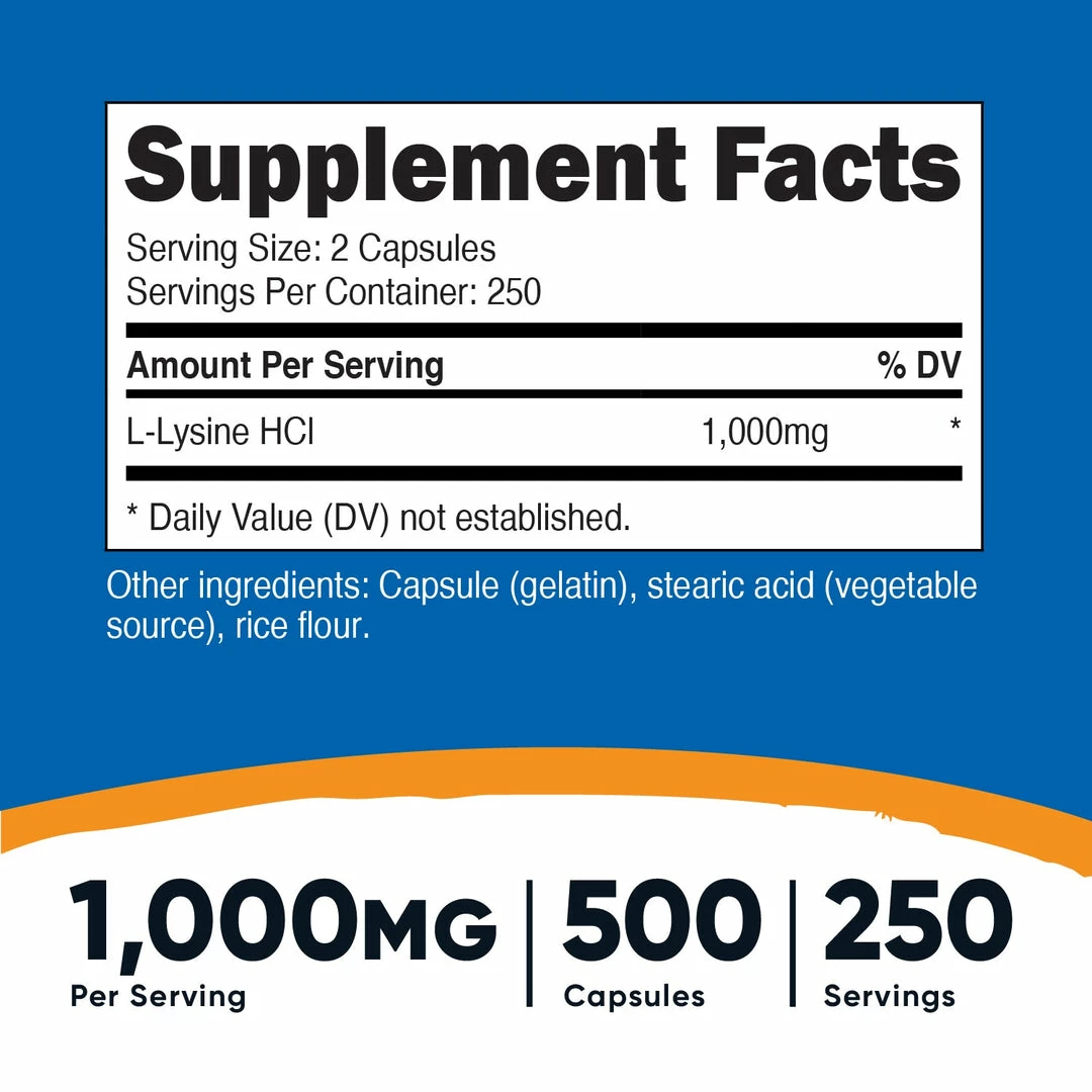 - 1000mg of Premium L-Lysine Per Serving, 500mg Per Capsule