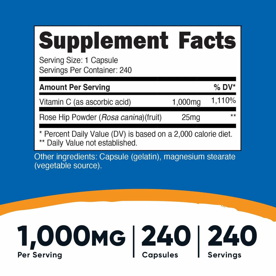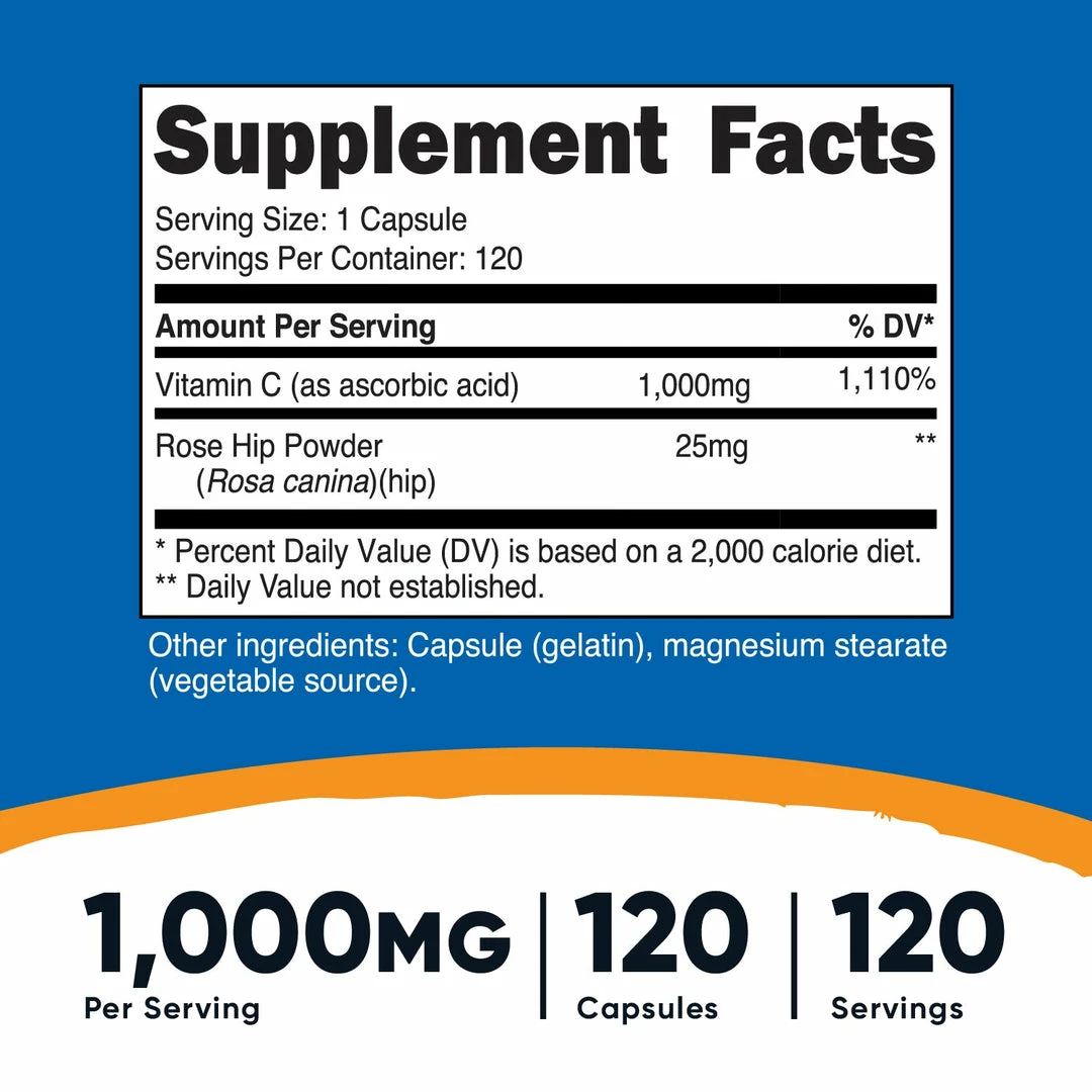 - Just one 1025mg Capsule Per Serving (1,000mg Vitamin C, 25mg Rose Hips)
