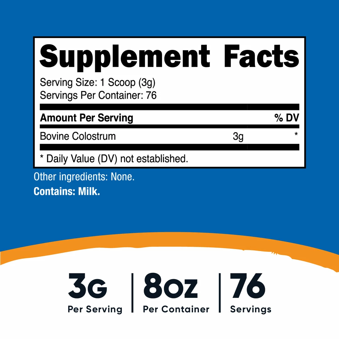 - Nutricost Bovine Colostrum Powder 8oz is pure colostrum and contains 3 grams of colostrum in every serving, 76 servings.