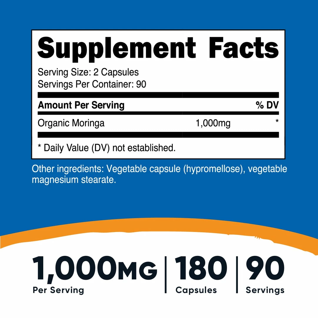 Nutricost Moringa capsules contains 90 servings with 1,000 milligrams of Moringa in every capsule.