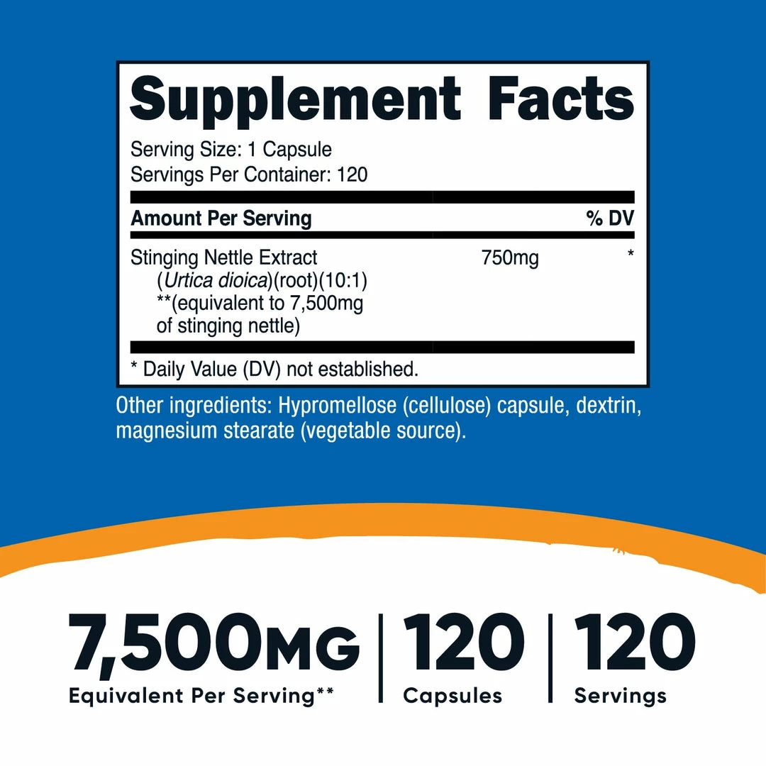 - 7,500mg of Stinging Nettle Extract, From 750mg of Stinging Nettle (10:1) Extract