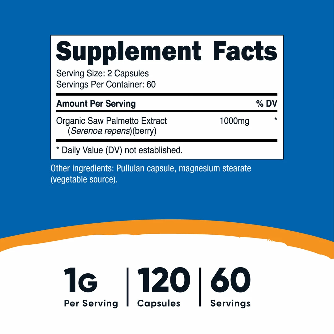 - 120 Capsules, 60 Servings of Organic Saw Palmetto Per Bottle