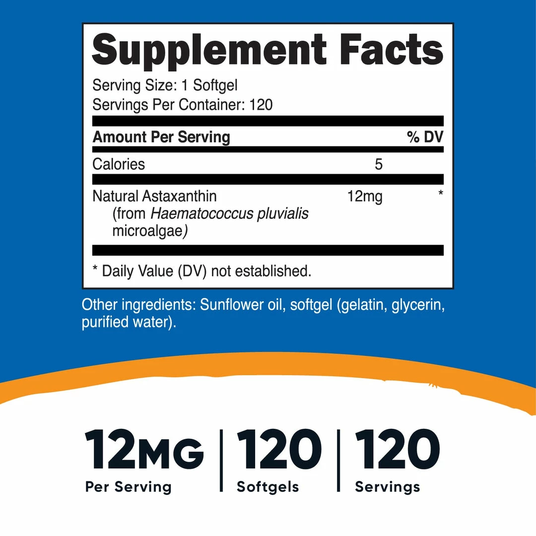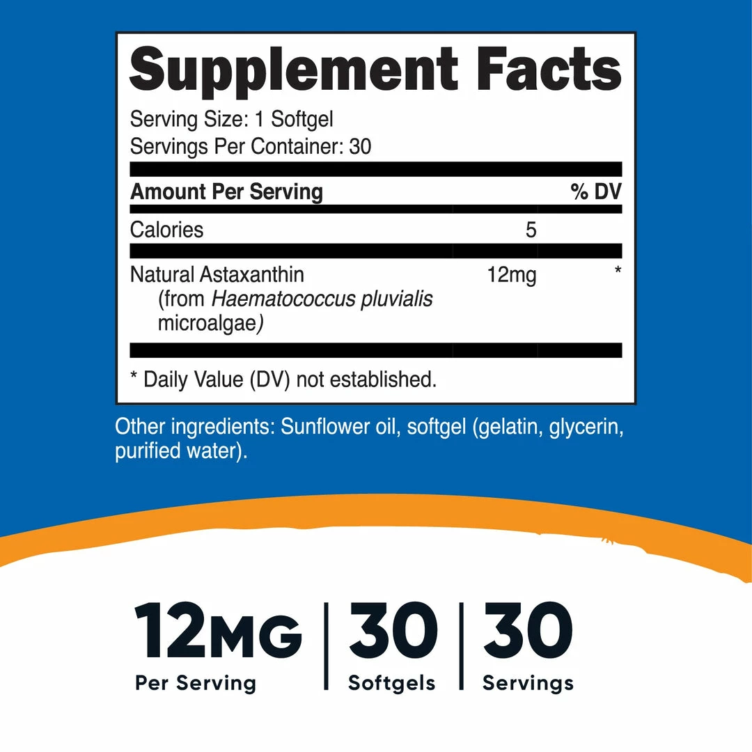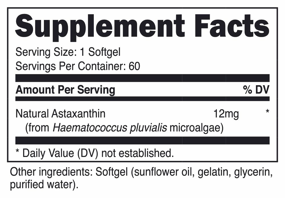 - 12mg Astaxanthin per Softgel with 30, 60, or 120 Softgels