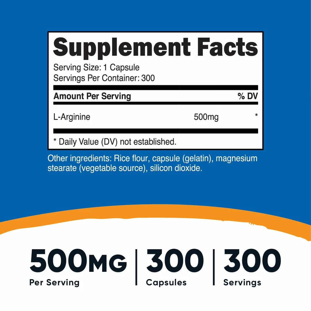 - 500mg of High Quality L-Arginine Per Capsule, 300 Capsules Per Bottle