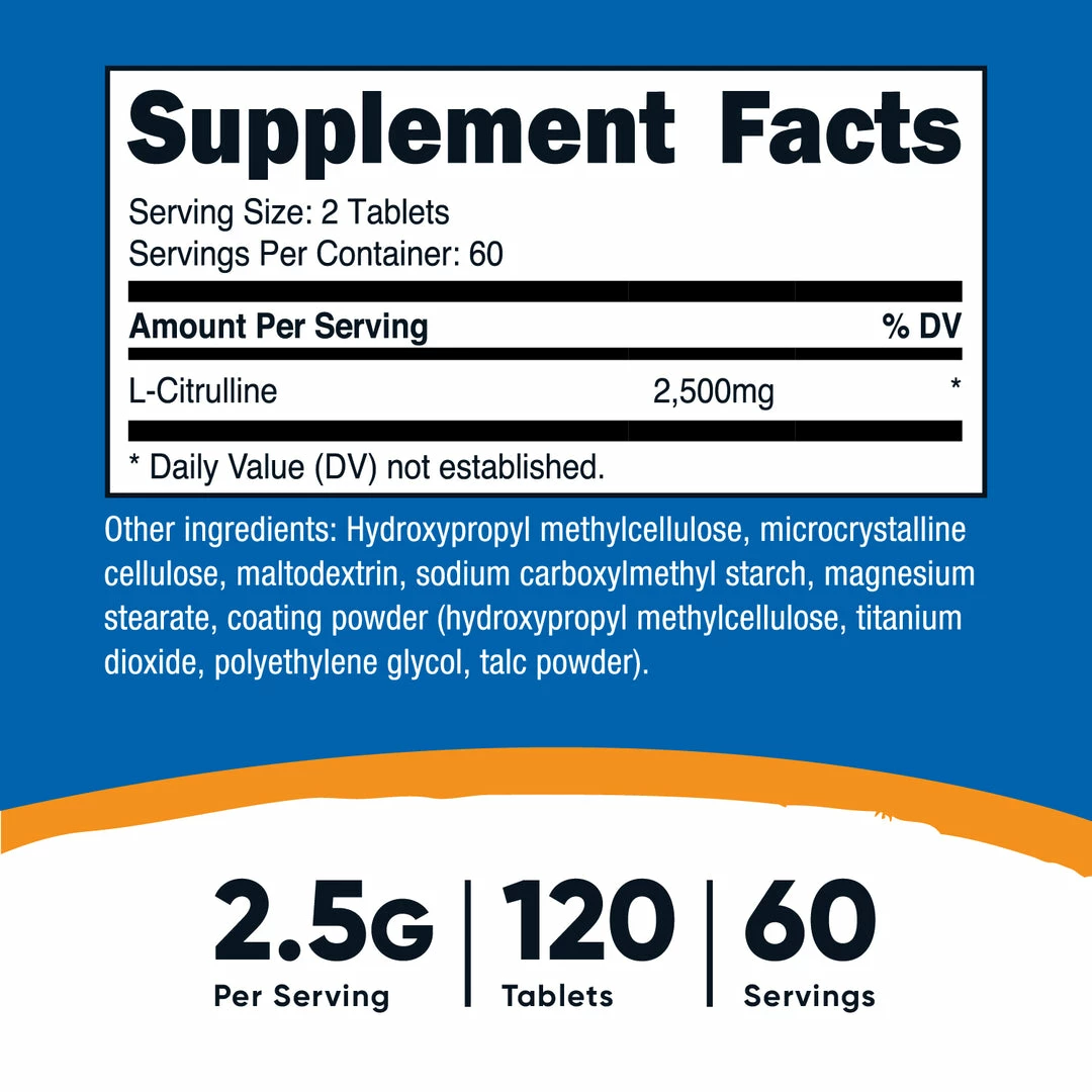 - Nutricost L-Citrulline tablets contain 2.5 grams (2500mg) of L-Citrulline in every serving.