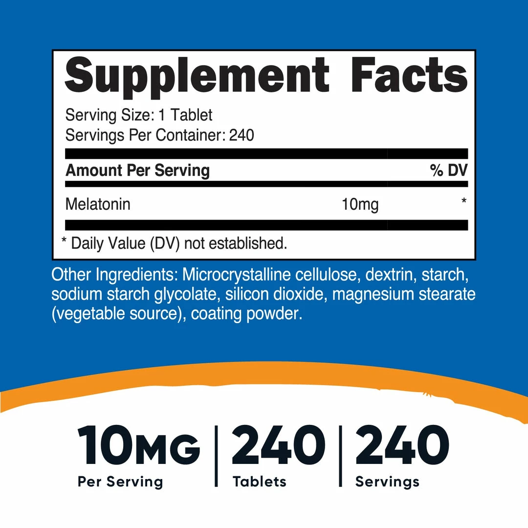 Melatonin by Nutricost helps support a healthy sleep cycle with 3mg, 5mg, 10mg, or 12mg of melatonin in each tablet. Each batch of this product is tested by independent iso-accredited laboratories. This supplement is non-GMO, gluten-free, and soy-free. Each bottle contains 240 melatonin tablets.