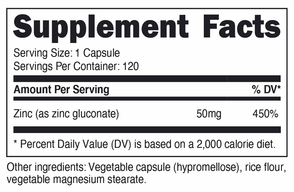 - 50 mg of Zinc (from Zinc Gluconate) Per Capsule