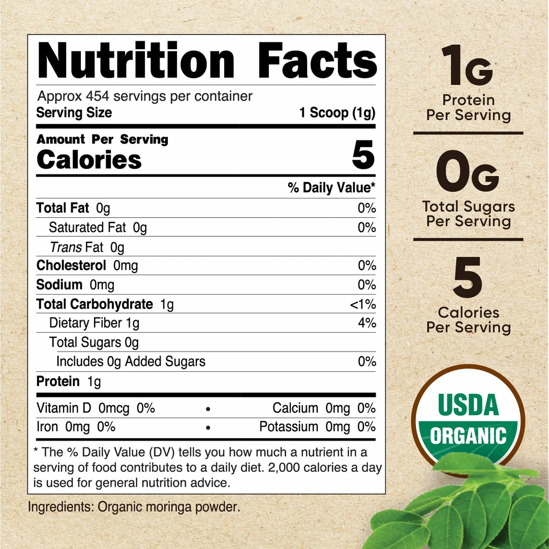 - 1 Pound (16 oz) of Organic Moringa Powder Per Bottle