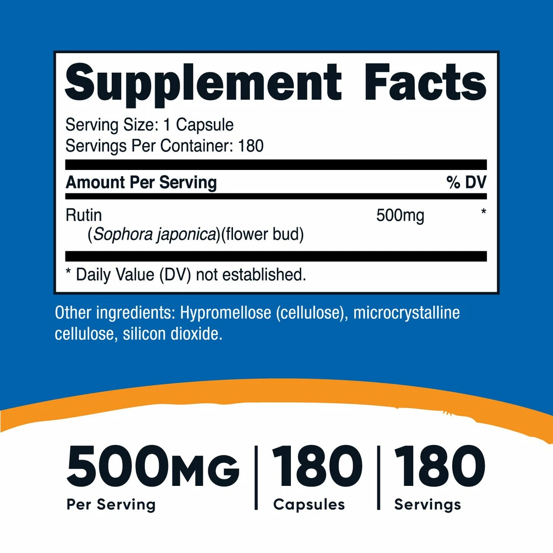 Nutricost’s Rutin has 500mg of rutin in every capsule. Each bottle contains 180 vegetarian-friendly capsules. If taken according to recommended use, one bottle is a 6 month supply. These rutin capsules are non-GMO, gluten-free, and tested by independent ISO-accredited laboratories.