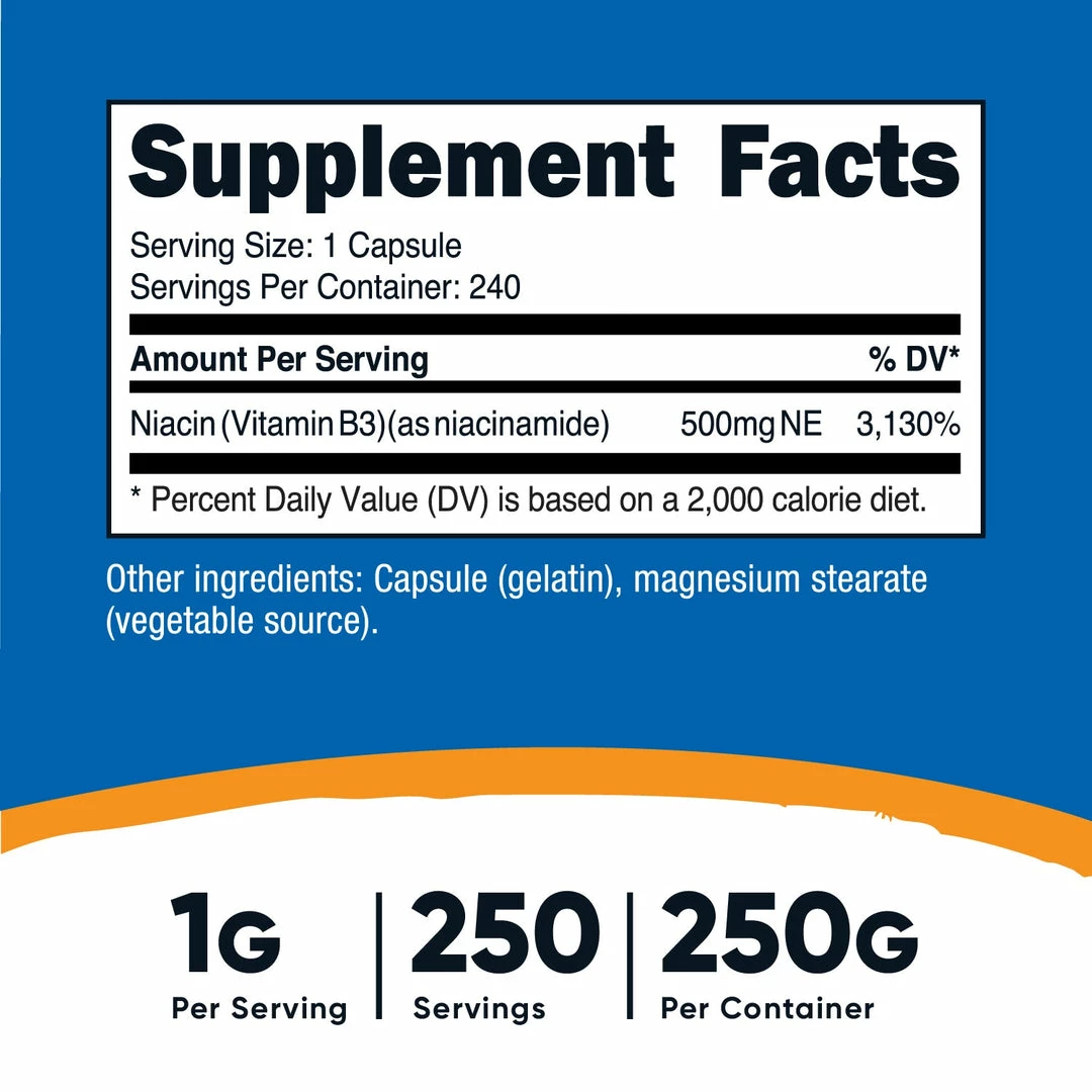 - 250 Grams of Pure Vitamin B3 (Niacin) Powder Per Bottle