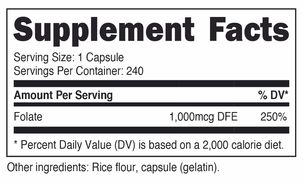- 1,000mcg of Folic Acid Per Capsule