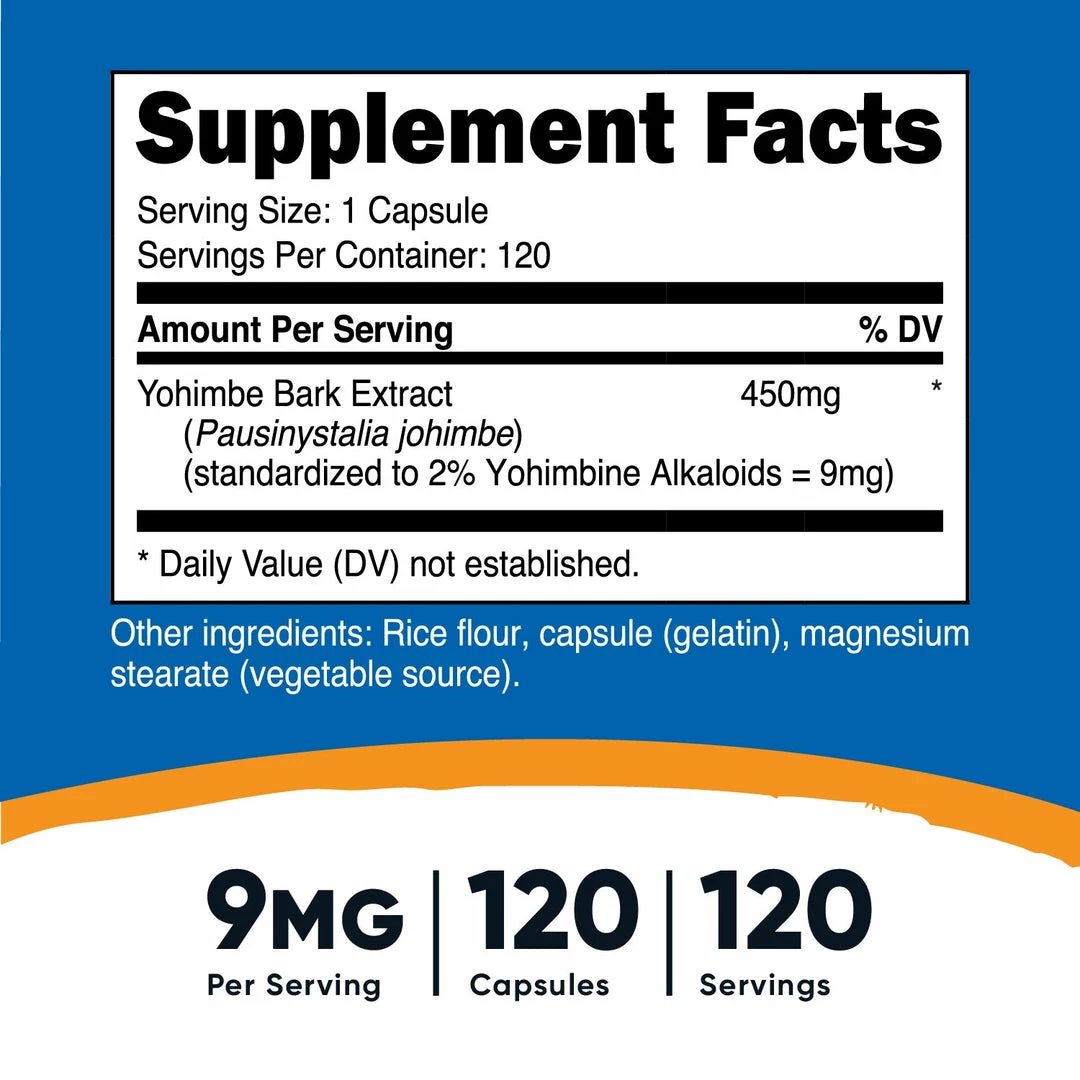 Nutricost Yohimbe Bark Extract capsules is standardized to 2% of Yohimbine Alkaloids (9mg) from 450mg of Yohimbe Bark Extract. Each bottle contains 120 Capsules. They are non-gmo, gluten free, and soy free.
